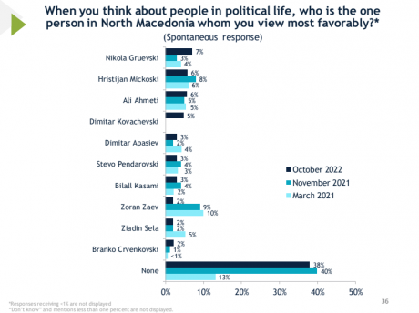 Сепак за претседателот на ВМРО-ДПМНЕ најболниот удар не е рејтингот на Ковачевски или на Ахмети со кого Мицкоски има еднаков рејтинг туку рејтингот на екс премиерот Никола Груевски кој во моментов е најпопуларен политичар во Република Македонија со рејтинг од 7 проценти.