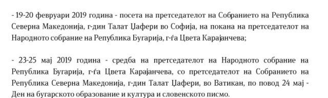 Во протоколот буквално стои: 23-25 мај 2019 година средба на претседателот на Народното собрание на Бугарија Цвета Карајанчева со претседателот на Собранието на Македонија Талат Џафери во Ваткикан по повод 24 мај Ден на бугарското образование, култура и словенското писмо.