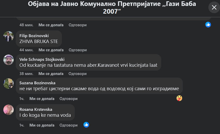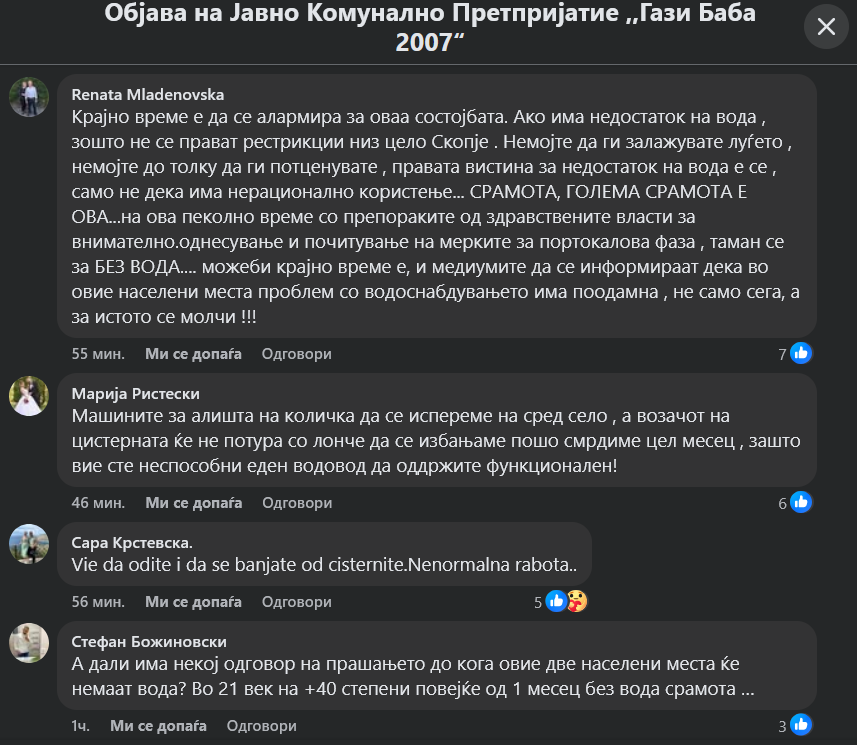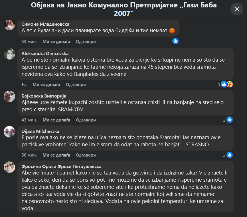 Граѓаните бурно реагираат и во коментари велат дека е срамота во 21 век на пеколни температури луѓето да немаат вода за пиење и да не можат да се избањаат.