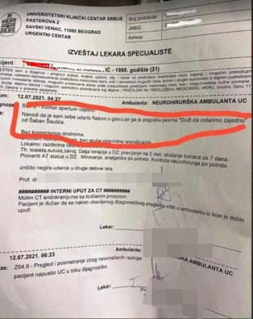 Во исказот даден околу 4 наутро во јули 2021 гоина навел дека се удрил сам себе со шише по глава бидејќи го погодила песната „Дојди да остариме заедно“ од Шабан Шаулиќ“.