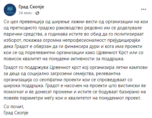 Градот го поддржува Црвениот крст кој организира летни кампови за деца од социјално загрозени семејства, релевантна организација со сеопфатни проекти кои се спроведуваат со широка поддршка. Градот е насочен на проекти што вистински ќе помогнат и ќе донесат промени и истите се бодуваат базирано на повеќе параметри меѓу кои и квалитетот на понудениот проект.Со почит, Град Скопје.” – стои во соопштението.