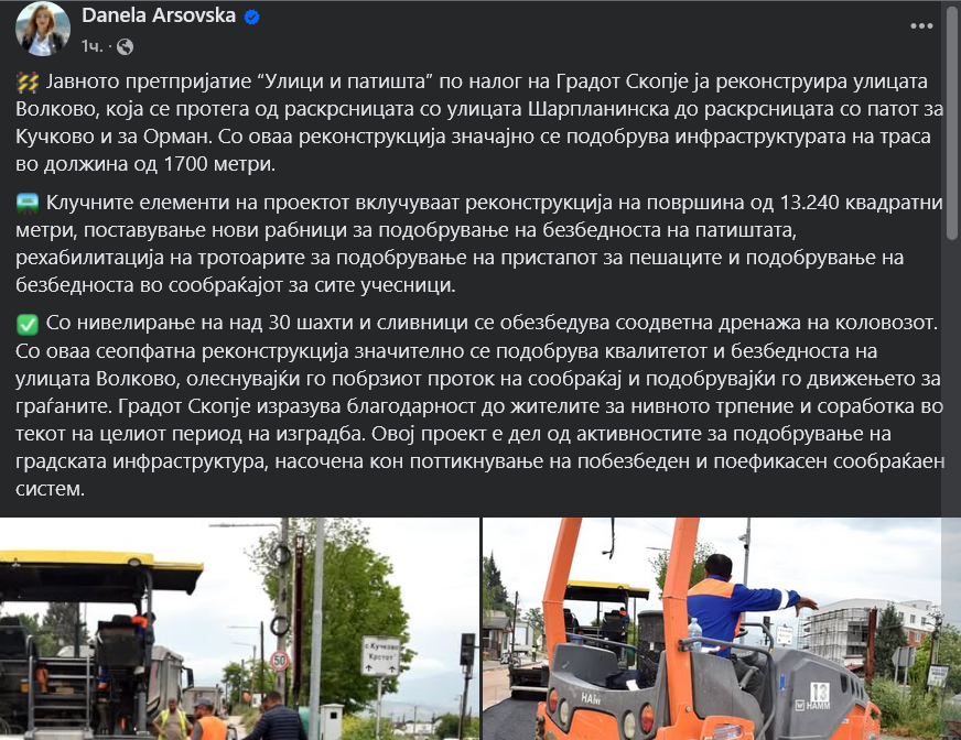 Јавното претпријатие “Улици и патишта” по налог на Градот Скопје ја реконструира улицата Волково, која се протега од раскрсницата со улицата Шарпланинска до раскрсницата со патот за Кучково и за Орман. Со оваа реконструкција значајно се подобрува инфраструктурата на траса во должина од 1700 метри, соопшти на Фејсбук градоначалничката на Град Скопје, Данела Арсовска.