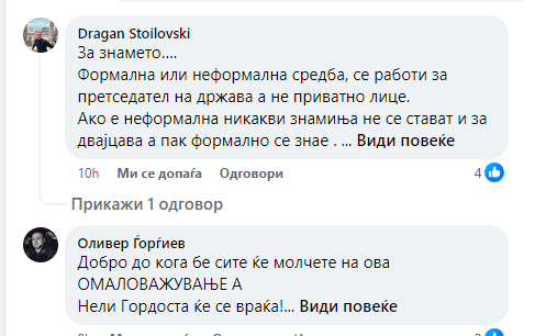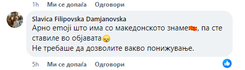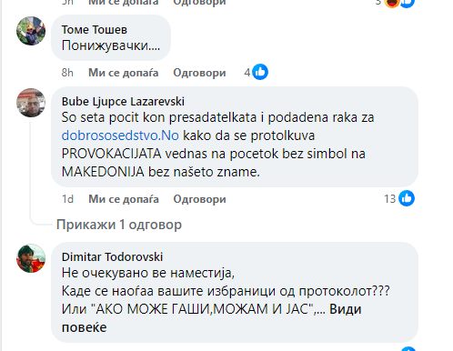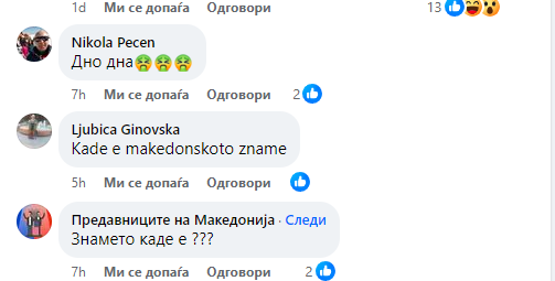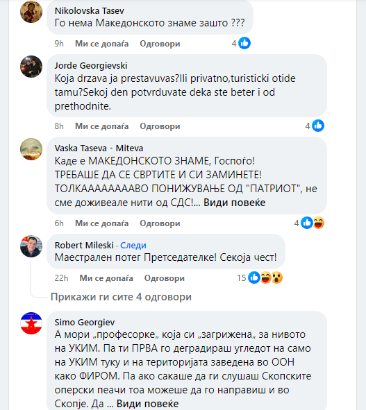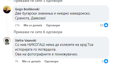 „Државничка посета без македонско знаме?“, „На која слика да го побараме македонското знаме? И ако го немале дали може да го убациме со фотошоп? Оти ова вака срамота“, „Каде е македонското знаме?“, „Претседателке, го допревте дното. Не само што го допревте почнавте да гребете по дното“, „Лажни патриоти насекаде. Гордана, кај ја остави државата што ја претставуваш?“, „Две бугарски знамиња и неиедно македонско. Срамота, Давкова!“ се дел од коментарите под објавата на претседателката.