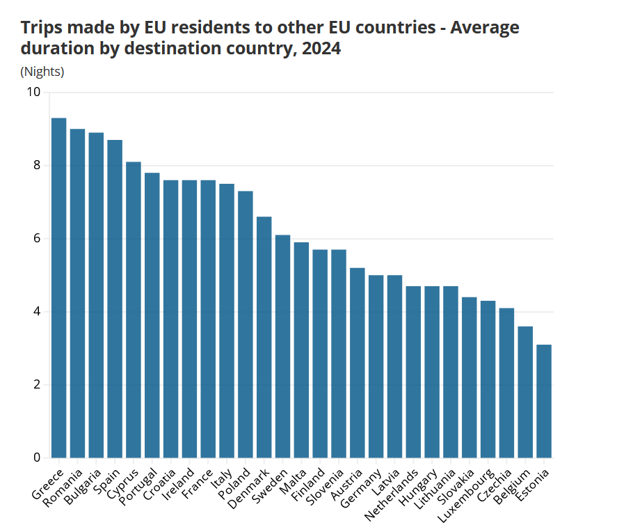 Двете земји го надминале просекот на ЕУ со околу девет ноќевања во просек. Спротивно на тоа, Естонија и Белгија биле дестинации каде што туристите го поминале најкраткиот престој, со 3,1 и 3,6 ноќевања, соодветно.