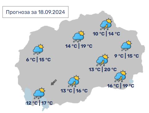 Од УХМР јавуваат дека времето денеска ќе биде променливо облачно со повремени локални врнежи од дожд. Врнежите ќе бидат пообилни во јужните делови, наместа поројни, проследени со појава на ретки грмежи. Ќе дува слаб до умерен променлив ветер.