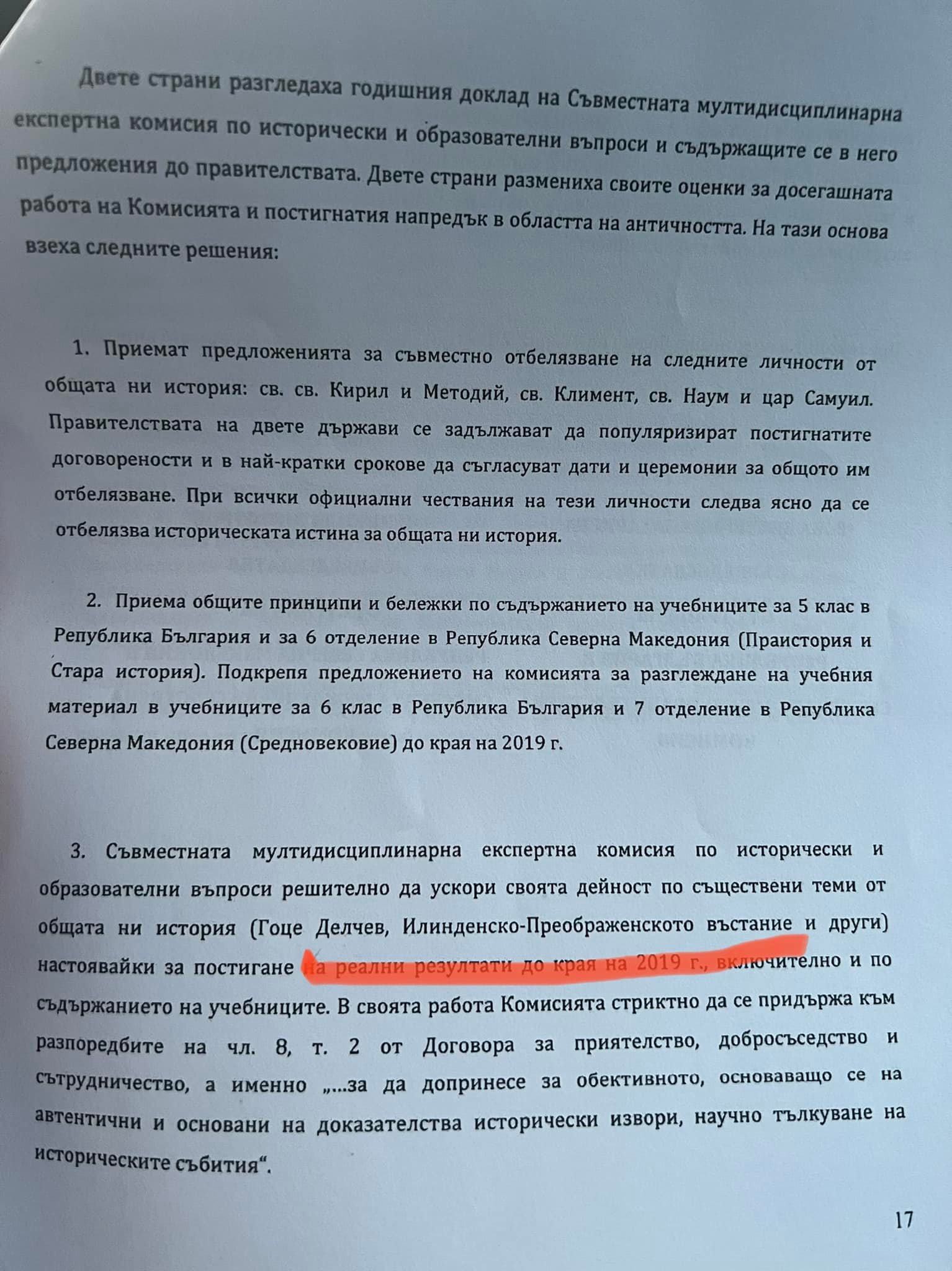 Второ, потпишувајќи го единствениот Протокол, мојот претходник ја обврзал и Комисијата, но и земјата, пред целиот свет, дека имаат краток рок до крајот на 2019 година, да најдат решение за Гоце Делчев и востанието, сега веќе и дефинирано согласно бугарската позиција како “Илинден Преображенско”