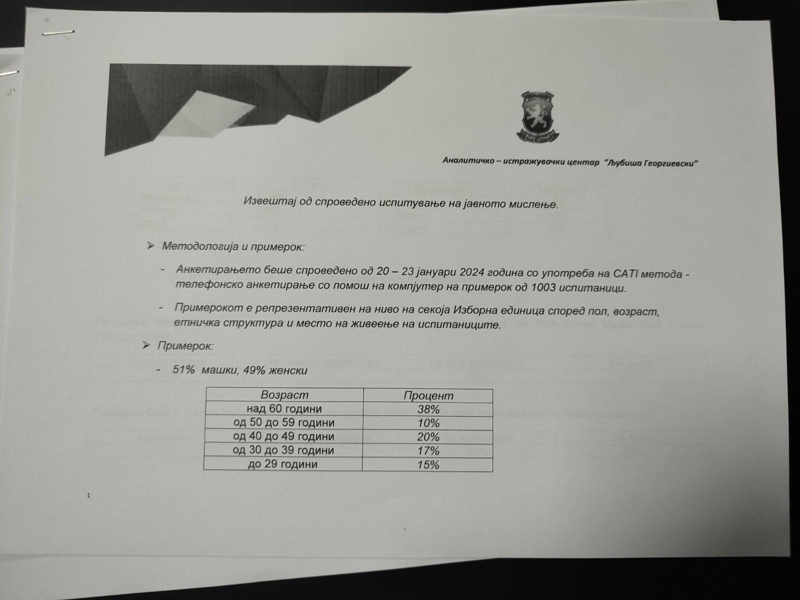 Aнкетата е спроведена пред помалку од 3 месеци во период од 20 до 23 јануари 2024 година со употреба на CATI метода и телефонско анкетирање на примерот од 1003 испитаници, доополнително примерот е репрезентативен на секоја изборна единица.