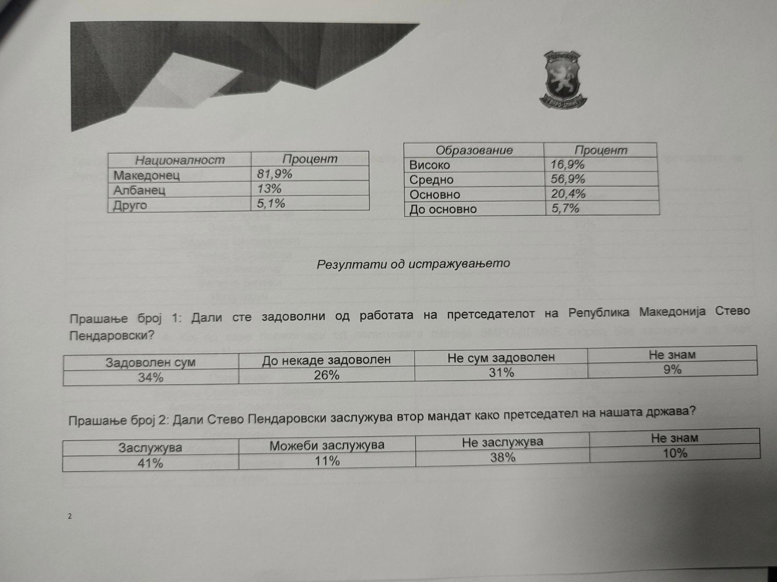 Имено на анкетите на Институтот, Стево Пендаровски води со рејтинг пред Гордана Сиљановска со солидна предност од 3 проценти. Не само што Пендаровски води пред Сиљановска туку кај општата македонска јавност има позитивна перцепција од над 60 проценти кај сите граѓани, а над 50 проценти од граѓаните сметаат дека треба да добие втор мандат.