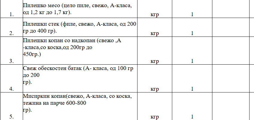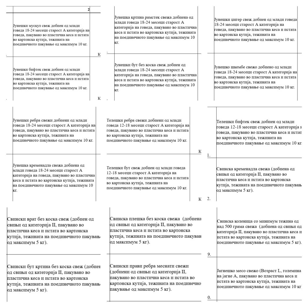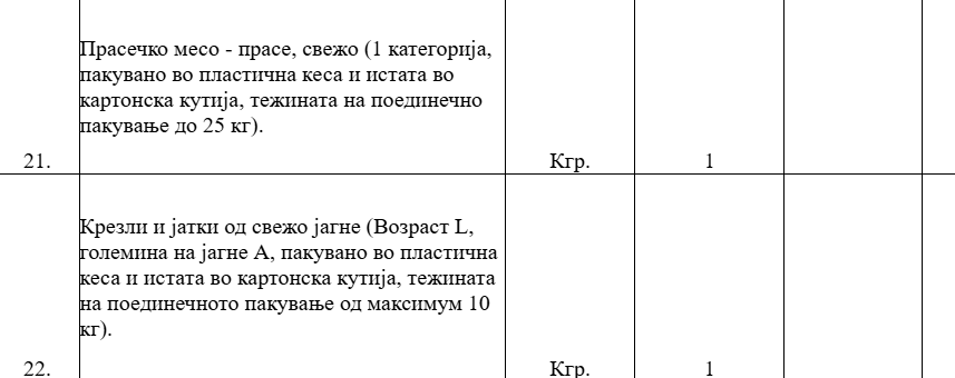 Преференците на повикот за свежото месо распишан од Службата за општи и заеднички работи се доста специфицирани. Се бара свеж јунешки мускул од млади говеда стари од 18 до 24 месеци (А категорија на говеда), јунешки бифтек добиен од млади говеда 18-24 месеци старост, јунешка кртина од млади говеда 18-24 месеци старост, јунешки бут без коска свеж добиен од млади говеда 18-24 месеци старост, јунешки џигер свеж добиен од млади говеда 18-24 месеци старост, јунешко шкембе свежо добиено од млади говеда 18-24 месеци старост, јунешки ребра свежи добиени од млади говеда 18-24 месеци старост, јунешкa кременадла свежа добиена од млади говеда 18-24 месеци старост, телешки ребра свежи добиени од млади говеда 12-18 месеци старост, телешки бут свеж добиен од млади говеда 12-18 месеци старост, телешки бифтек свеж добиен од млади говеда 12-18 месеци старост, свежа свинска кременадла добиена од свињи од категорија II, свежо свинско филе од иста таква свиња, свинско каре, свински врат без коска, свински бут кртина без коска, свинска плешка без коска, свински прави ребра меснати свежи, свинска коленица, јагнешко месо, свежо прасе прва категорија, крезли и јатки од свежо јагне. Ќе има и пилешко месо и тоа цели пилиња, пилешки стекови, копани со надкопани, обескостени батаци, мисиркини копани итн.