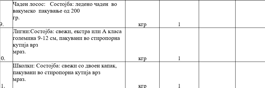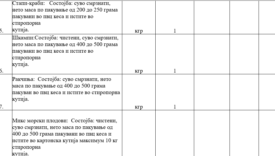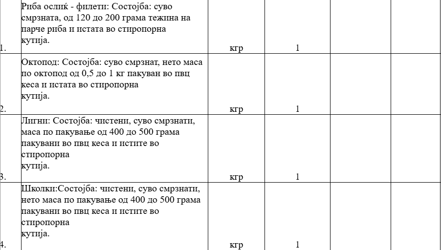 Службата за општи и заеднички работи бара добавувач и за морски плодови. Во повикот се бара економските оператори да наведат цени по килограм за филети ослиќ, суво смрзнат октопод, чистени лигни, чистени школки, краби, шкампи, ракчиња, микс морски плодови, чаден лосос.