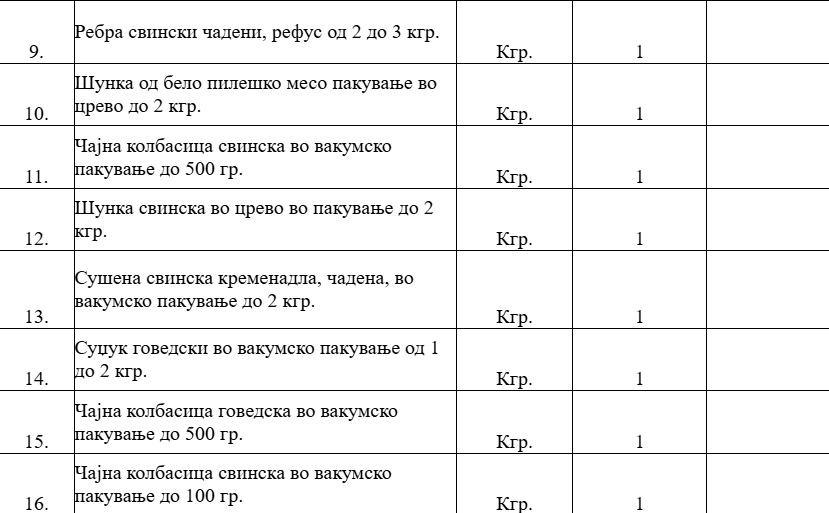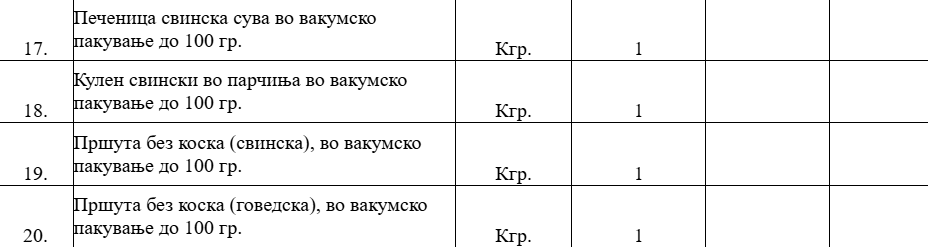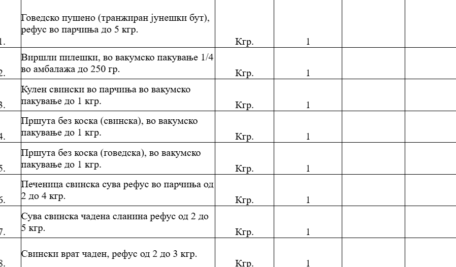 Од сувомеснатите производи се бараат следните артикли: говедско пушено (транжиран јунешки бут), пилешки виршли, свински кулен, свинска пршута без коски, говедска пршута без коски, свинска печеница, чадена свинска сланина, чаден свински врат, чадени свински ребра, пилешка и свинска шунка, свинска чајна колбасица, сушена свинска кременадла и говедски суџук.