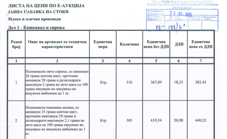 Додека се чека да се изберат фирмите што ќе доставуваат месо, риби и морски плодови, Службата за општи и заеднички работи веќе го заврши тендерот за леб, кори и кадаиф. Вкупната вредност на овој договор објавен во февруари годинава е 492 илјади денари. Што се однесува до млекото и млечните производи, од документите објавени на страницата на Бирото за јавни набавки, евидентно е дека млекото од страна на СОЗР се проектира во далеку поголеми количини од оние што му се „потребни“ на едно просечно четиричлено семејство според потрошувачката кошничка. Нејасно е за колку лица е набавката, ама во ценовникот на фирмата што го добила тендерот на СОЗР за млеко, евидентно е дека дала цена за 2.500 литри млеко и 600 килограми кашкавал. Сепак, овие бројки се ориентациони и може да не се потрошат и СОЗР не е обврзан да ги нарача, туку фирмата е должна да ги даде цените согласно одредена количина која може, а и не мора да се потроши.