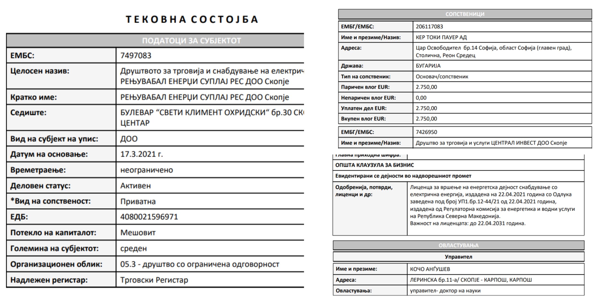 Имено компанијата РЕЊУВАБАЛ ЕНЕРЏИ СУПЛАЈ ДОО е поволина во сопствеништвото на компанијата Централ Инвест од Македонија која е директно во сопственост на Кочо Анѓушев, а другата половина е во сопственост на компанијата Кер Токи Пауер од Бугарија која сега во целост ја купува компанијата на Кочо Анѓушев.