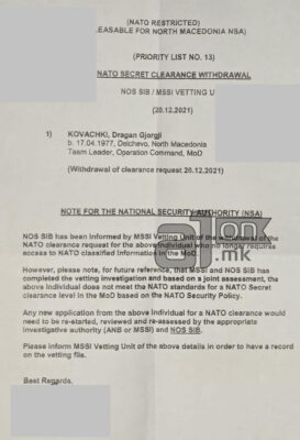 „НАТО канцеларијата за безбедност иако барањето за ветинг е повлечено, сепак ја комплетираше ветинг истрагaта и врз основа на заедничката проценка на двете тела погоре споменатата личност не ги исполнува стандардите на НАТО за да поседува НАТО безбедносен сертификат“, стои во дописот.