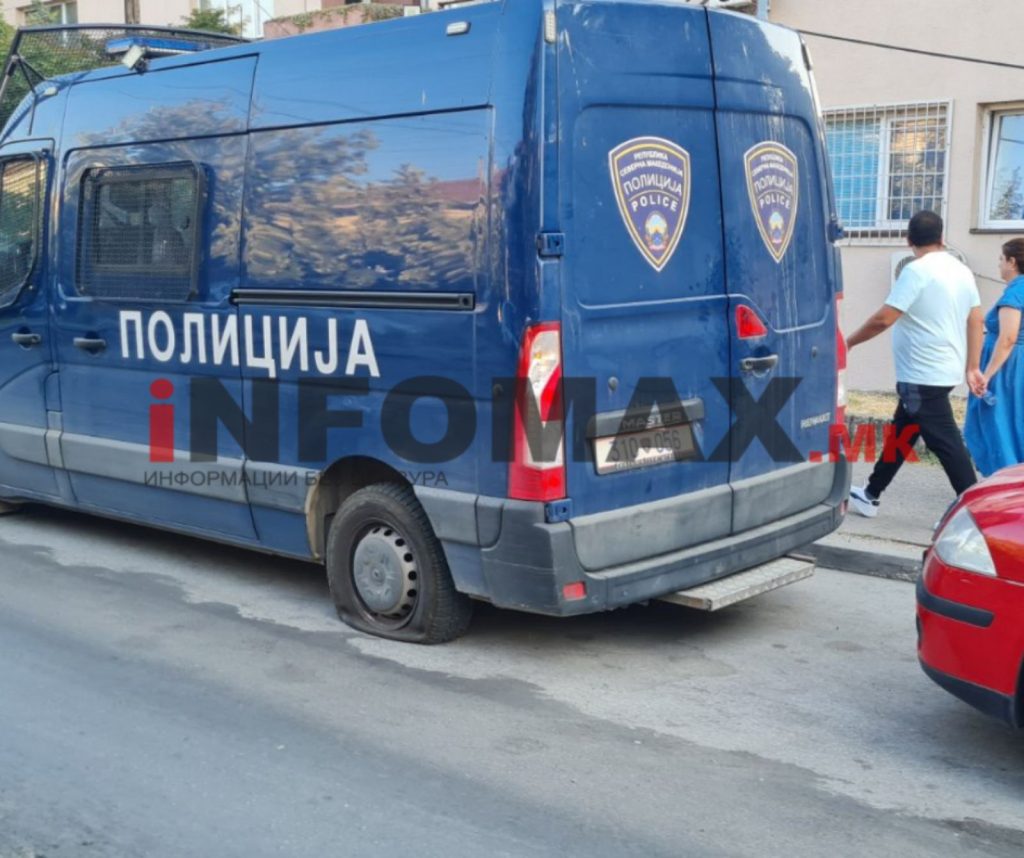 Државиште: Полициско комбе со издишани гуми стои пред ПС Кочани