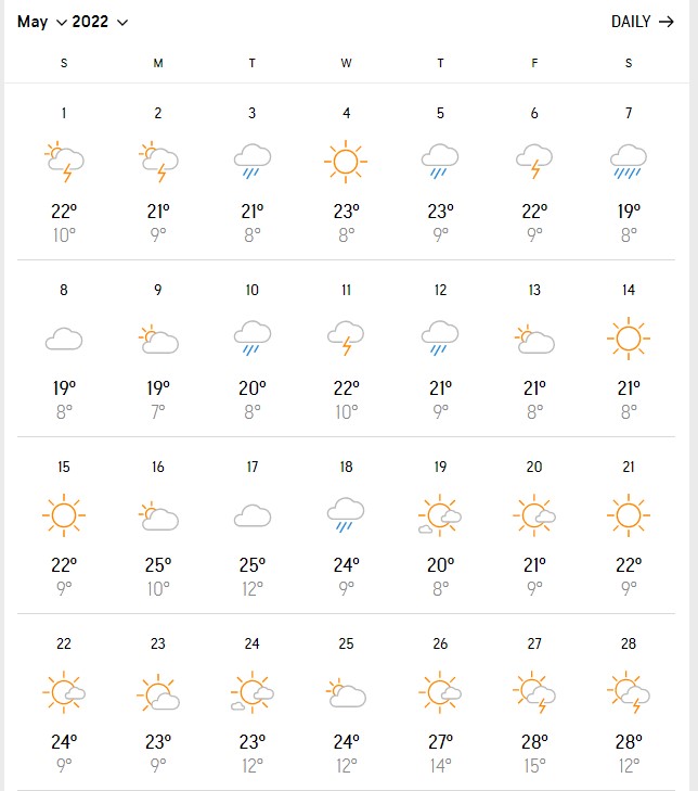 Сепак, највисоката температура според страната „Accuweather“ се очекува на крајот од месецот кога истата ќе изнесува максимални 28 степени.