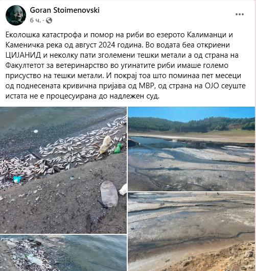 Во водата беа откриени ЦИЈАНИД и неколку пати зголемени тешки метали а од страна на Факултетот за ветеринарство во угинатите риби имаше големо присуство на тешки метали. И покрај тоа што поминаа пет месеци од поднесената кривична пријава од МВР, од страна на ОЈО се уште истата не е процесуирана до надлежен суд, пишува на Фејсбук Горан Стоименовски.