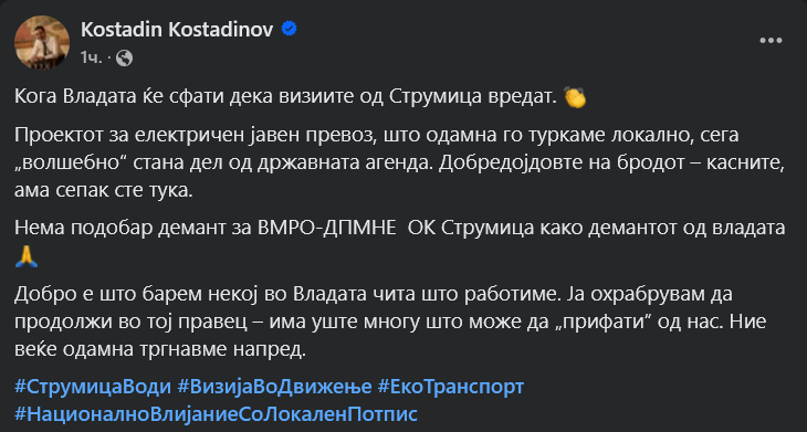 Добредојдовте, ама доцните, ѝ порача струмичкиот градоначалник Костадин Костадинов на Владата откако електричниот јавен превоз стана дел од државната агенда.