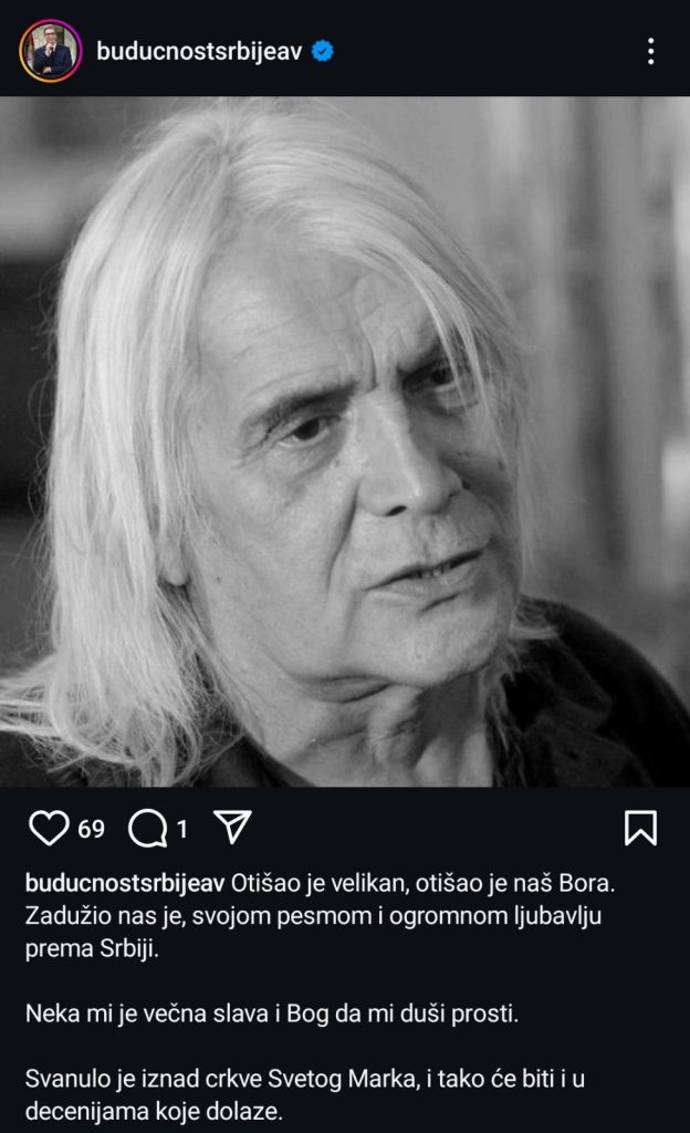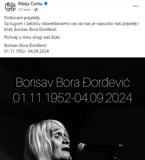 Легендарниот рокер, фронтмен на групата „Рибља чорба“, Бора Ѓорѓевиќ, почина денеска, 4 септември, на 72-годишна возраст.