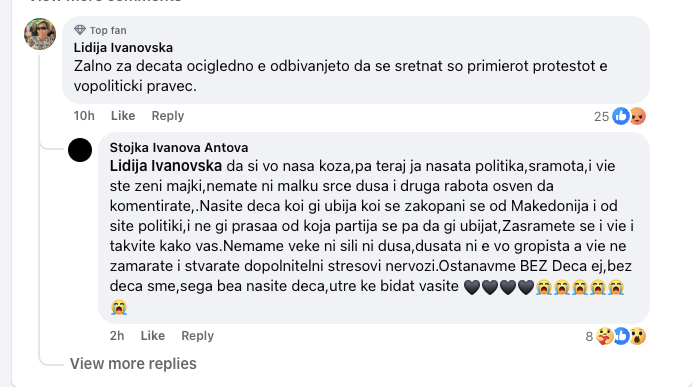 „Да не си во наша кожа, па терај ја нашата политика, срамота, и вие сте жени, мајки, немате ли малку срце и друга работа, освен да коментирате. Нашите деца кои ги убија кои се закопани, сѐ од Македонија и од сите политики, и не ги прашаа од која партија се па да ги убијат. Засрамете се и вие нѐ замарате и ни ставате дополнителни стресови и нервози. Останавме без деца еј, без деца сме, сега нашите деца ќе бидат, утре вашите“, напиша Антова како одговор на коментарот.