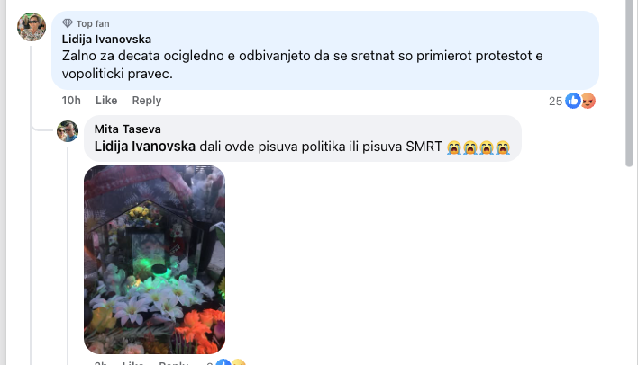 Мита Тасева, мајката на загинатиот диџеј Стефан Тасевски, пак ги праша: „Дали овде пишува политика или смрт“, објавувајќи фотографија од гробот на своето дете.