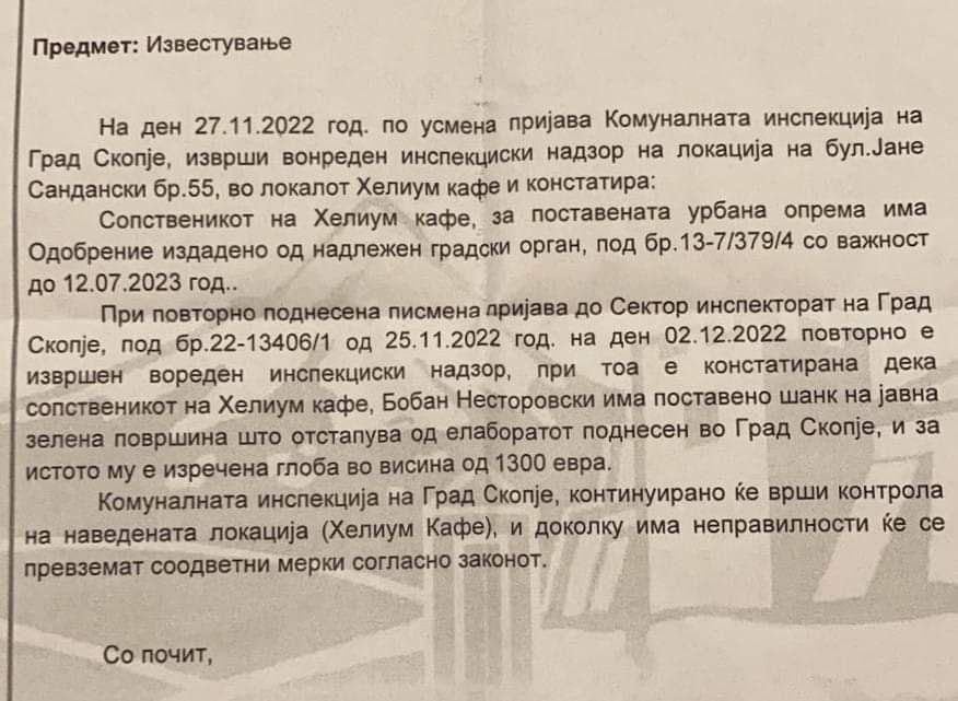 – Од Одделението за комунална инспекција при Град Скопје, до советниците на Левица во Град Скопје, пристигна известување по вонредниот инспекциски надзор извшен на локацијата на “Хелиум кафе” во скопската населбата Ново Лисиче – во кое се констатира дека сопственикот Бобан Несторовски, спротивно на елаборатот поднесен во Град Скопје, узурпира јавна зелена површина.
