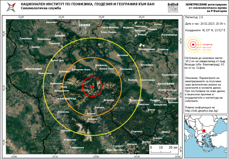 Слаб земјотрес со јачина од 2,6 степени според Рихтеровата скала е регистриран во 20 часот и 36 минути (по бугарско време) кај Самоков, покажуваат податоците на Националниот институт за геофизика, геодезија и географија при БАН.