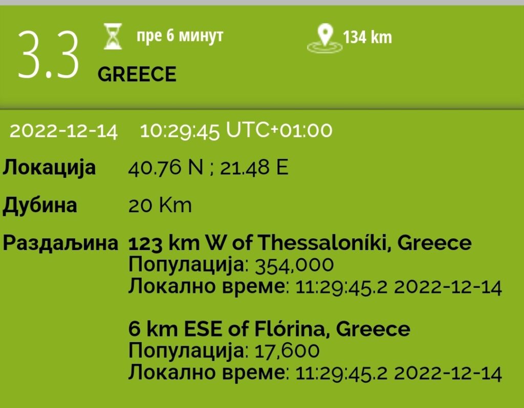 Земјотресот бил со јачина од 3.3 степени според Рихтер, а бил почувствуван и во Битола.