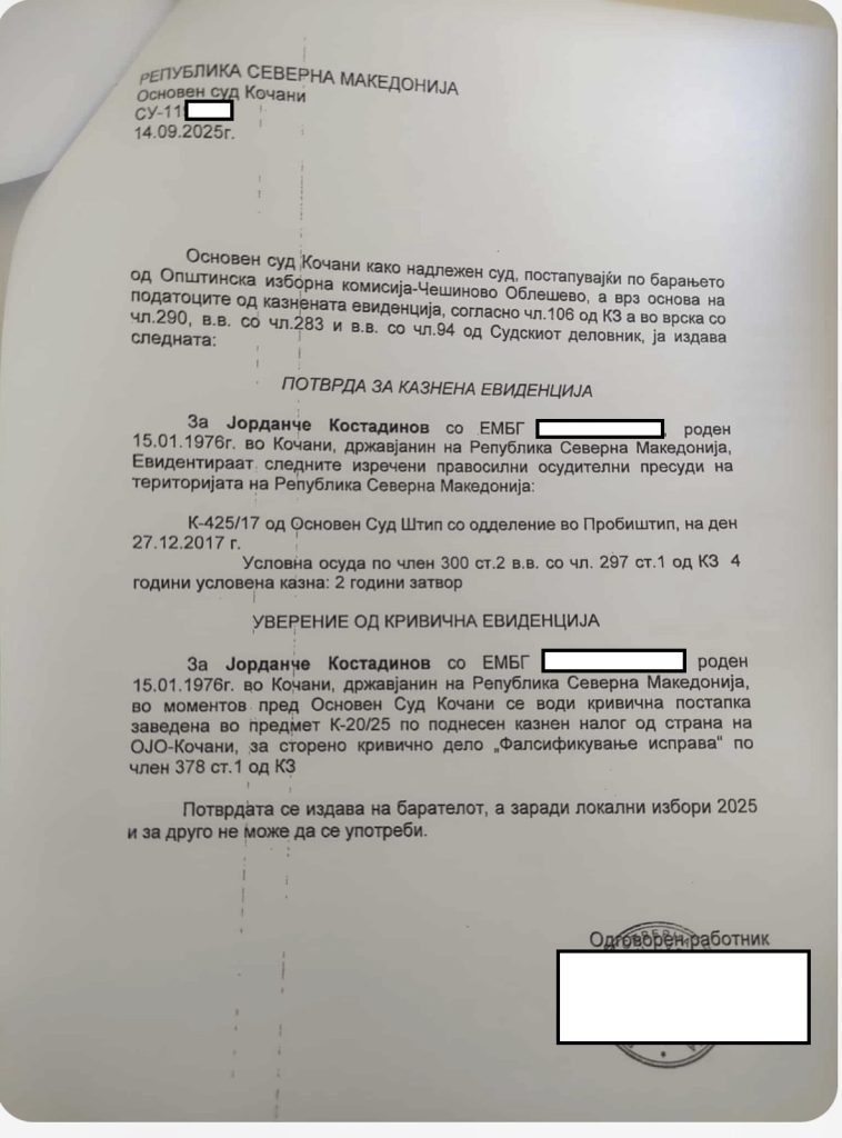 До редакцијата на Инфомакс беше доставена потврдата за казнена и кривична евиденција на кандидатот за градоначалник, Јорданчо Костадинов.