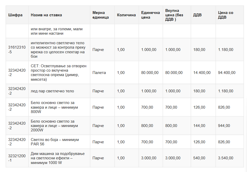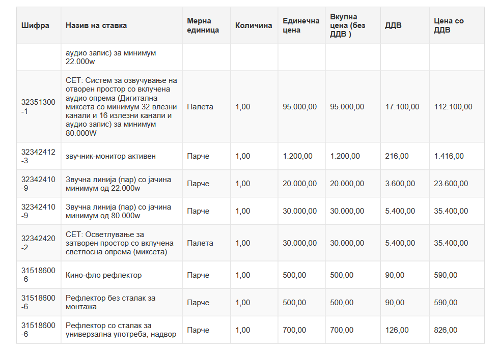 Иако прво во очи ви паѓа „симултан превод“, доколку ја погледнете финансиската понуда од компанијата ќе забележите дека најмалку има превод. Компанијата практично ќе организира настани, а дел од финансиската опрема се озвучување, микрофони, бубици, монитори, осветлување, дим-машини, видео ѕидови во различна големина, проектори, слушалки, шатори и слично.