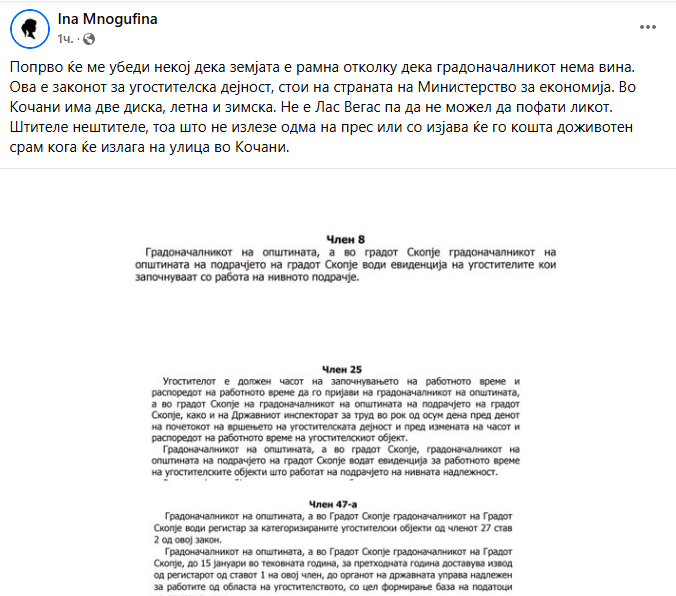 – Ова е законот за угостителска дејност, стои на страната на Министерство за економија. Во Кочани има две диска, летна и зимска. Не е Лас Вегас па да не можел да пофати ликот. Штителе нештителе, тоа што не излезе одма на прес или со изјава ќе го кошта доживотен срам кога ќе излага на улица во Кочани. – стои во објавата на Фејсбук.