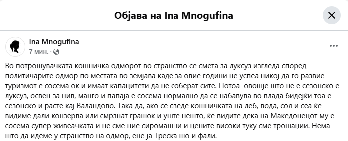 Во потрошувачката кошничка одморот во странство се смета за луксуз изгледа според политичарите одмор по местата во земјава каде за овие години не успеа никој да го развие туризмот е сосема ок и имаат капацитети да не соберат сите. Потоа овошје што не е сезонско е луксуз, освен за нив, манго и папаја е сосема нормално да се набавува во влада бидејќи тоа е сезонско и расте кај Валандово. Така да, ако се сведе кошничката на леб, вода, сол и сеа ќе видиме дали конзерва или смрзнат грашок и уште нешто, ќе видите дека на Македонецот му е сосема супер живеачката и не сме ние сиромашни и цените високи туку сме трошаџии. Нема што да идеме у странство на одмор, ене ја Треска шо и фали.