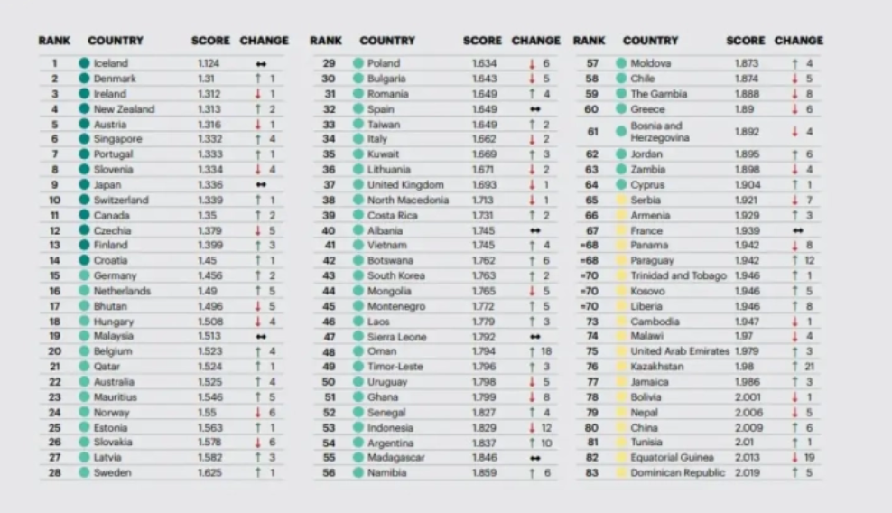 Најбезбедна земја во светот и за 2023 година е Исланд. Оваа земја во Северна Европа е на врвот на овој список секоја година од 2008 година. Данска е втора на листата, делумно поради ниското ниво на владина корупција, а трета е Ирска, којашто скокна за пет места во однос на лани.