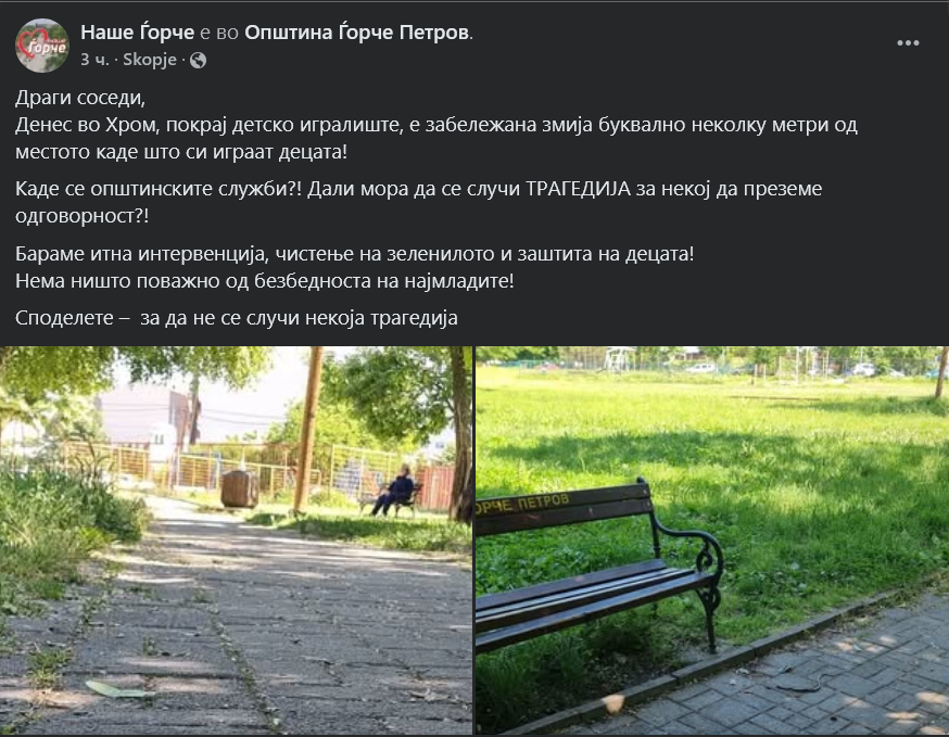 -Драги соседи, денеска во Хром, покрај детско игралиште е забележана змија буквално неколку метри од местото каде што си играат децата. Каде се општинските служби?! Дали мора да се случи трагедија за некој да преземе одговорност?!- велат од „Наше Ѓорче“ во објавата.