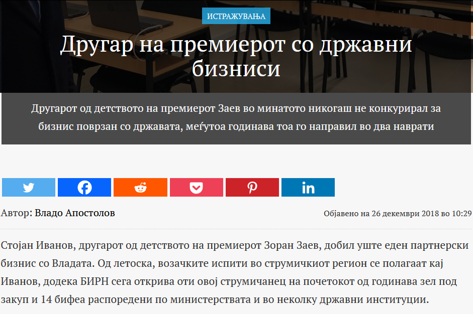 Иванов е човекот кој цела Македонија го знае како школскиот на Заев, ВМРО-ДПМНЕ во повеќе наврати имаат реагирано дека истиот има привилегии поради блиските релации со поранешниот премиер. Од друга страна пак, новата сопственичка структура на Испитен центар Струмица е во релација со ВМРО-ДПМНЕ. Сопственикот и управителот се блиски со Јорданчо Јанев, кој е баџанак на Мицкоски. Управителот и Јанев се донатори на ВМР0-ДПМНЕ, што е видливо од финансиските извештаи на партијата и на Државниот завод за ревизија.