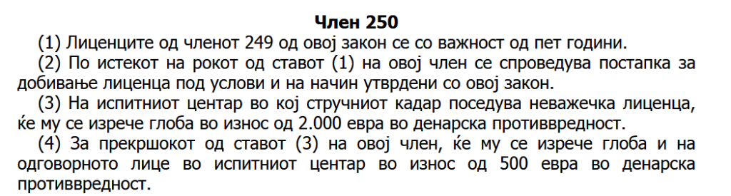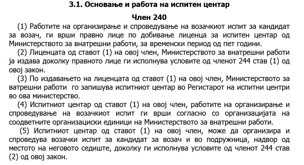 Согласно Законот, Работите на организирање и спроведување на возачкиот испит за кандидат за возач, ги врши правно лице по добивање лиценца за испитен центар од Министерството за внатрешни работи, за временски период од пет години. Лиценцата Министерството за внатрешни работи ја издава доколку правното лице ги исполнува условите од членот 244 став (1) од овој закон. По издавањето на лиценцата Министерството за внатрешни работи го запишува испитниот центар во Регистарот на испитни центри во ова министерство.
