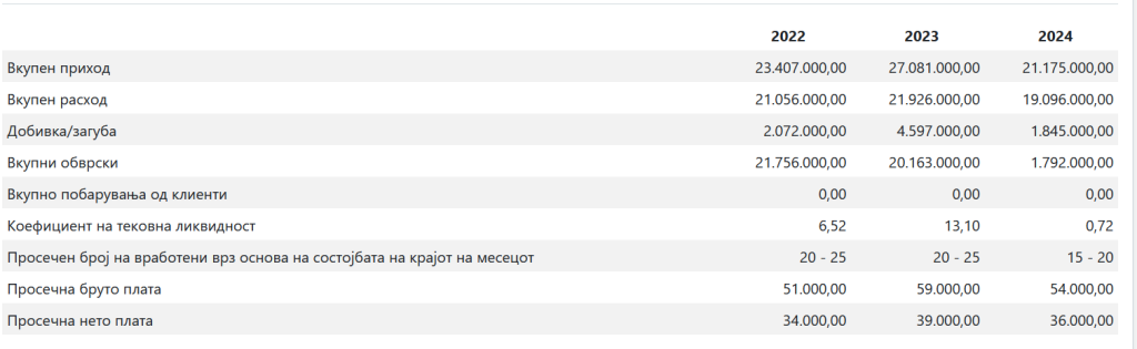 Компанијата брои вкупно двајца вработени, додека просечната бруто плата по вработен е 38.405,83 месечно.