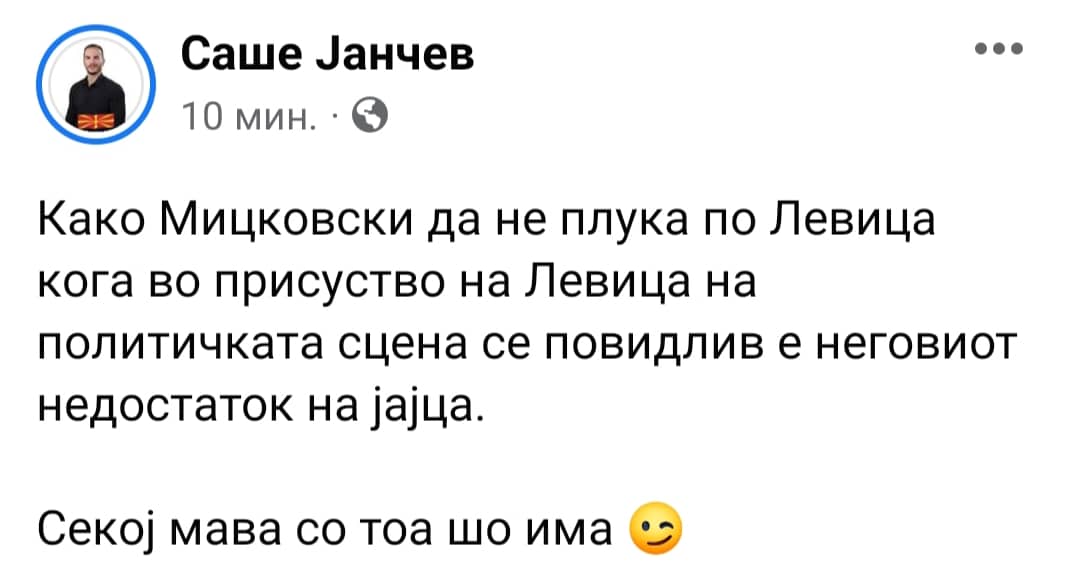 ,,Како Мицковски да не плука по Левица кога во присуство на Левица на политичката сцена се повидлив е неговиот недостаток на јајца.