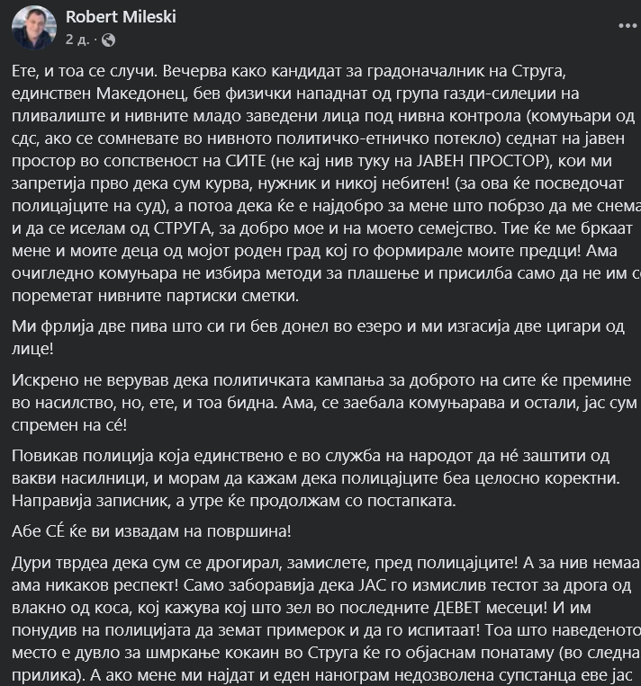 Независен кандидат за градоначалник на Струга на социјалните мрежи сподели дека бил физички нападнат и навредуван. Роберт Милески на неговиот Фејсбук профил сподели непријатен настан каде, покрај навредите, според неговите зборови бил и физички малтретиран поради тоа што е кандидат за градоначалник.