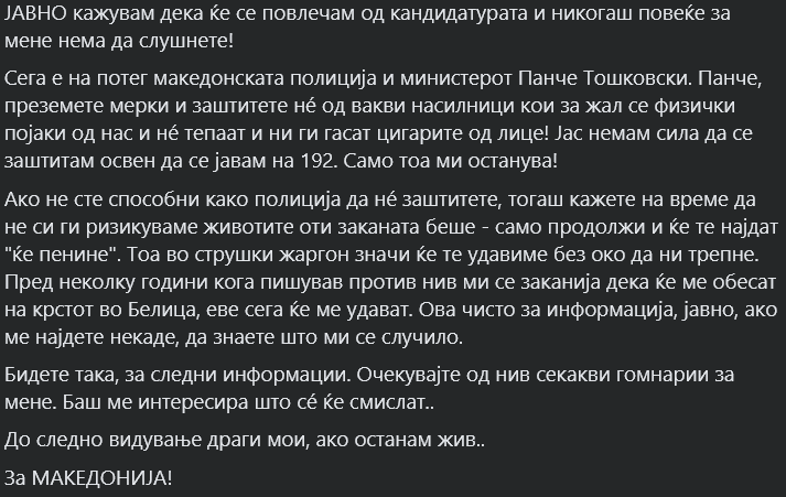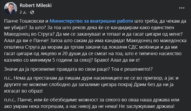 – Панче Тошковски и Министерство за внатрешни работи што треба, да чекам да ме убијат? За што? За тоа што реков дека ќе се кандидирам како единствен Македонец во Струга? Да ми се закануваат и тепаат и да гасат цигари од мене? Алал да ви е Панче! Затоа што сакам да има кандидат Македонец во македонска општина Струга да морам да трпам закани од локални СДС моќници и да ми гасат цигари од лицево и 20 души да се смеат на тоа, што е типично насилство казниво со минимум 5 години за секој? Браво! Алал да ви е!