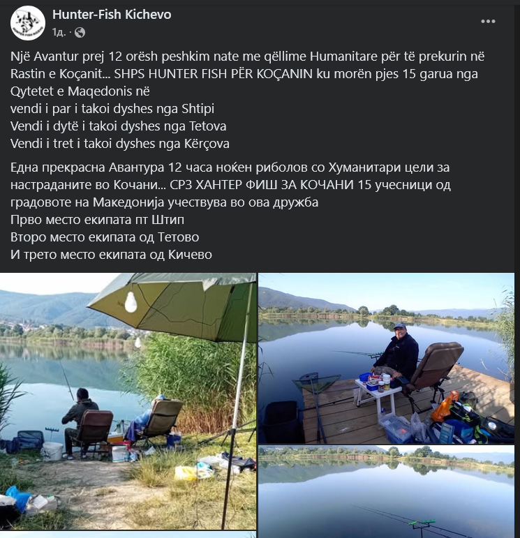 – Една прекрасна Авантура 12 часа ноќен риболов со Хуманитари цели за настраданите во Кочани… СРЗ ХАНТЕР ФИШ ЗА КОЧАНИ 15 учесници од градовоте на Македонија учествува во ова дружба