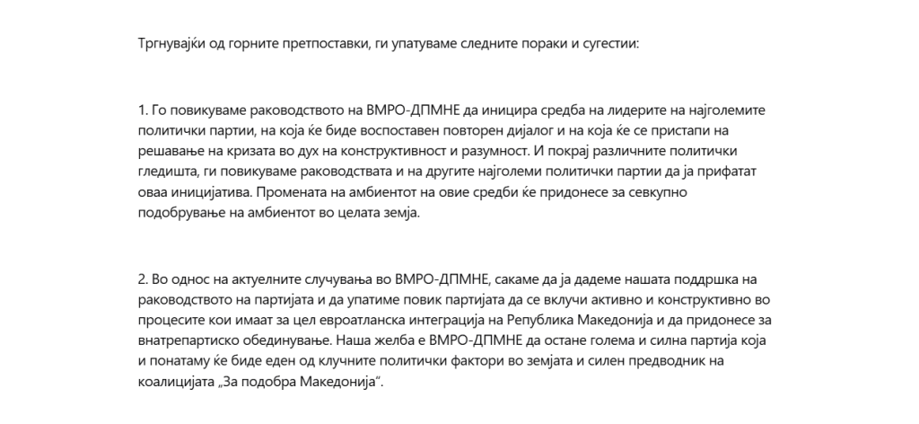 1. Го повикуваме раководството на ВМРО-ДПМНЕ да иницира средба на лидерите на најголемите политички партии, на која ќе биде воспоставен повторен дијалог и на која ќе се пристапи на решавање на кризата во дух на конструктивност и разумност. И покрај различните политички гледишта, ги повикуваме раководствата и на другите најголеми политички партии да ја прифатат оваа иницијатива. Промената на амбиентот на овие средби ќе придонесе за севкупно подобрување на амбиентот во целата земја.