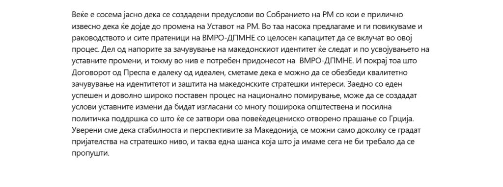 Веќе е сосема јасно дека се создадени предуслови во Собранието на РМ со кои е прилично извесно дека ќе дојде до промена на Уставот на РМ. Во таа насока предлагаме и ги повикуваме и раководството и сите пратеници на ВМРО-ДПМНЕ со целосен капацитет да се вклучат во овој процес. Дел од напорите за зачувување на македонскиот идентитет ќе следат и по усвојувањето на уставните промени, и токму во нив е потребен придонесот на ВМРО-ДПМНЕ. И покрај тоа што Договорот од Преспа е далеку од идеален, сметаме дека е можно да се обезбеди квалитетно зачувување на идентитетот и заштита на македонските стратешки интереси. Заедно со еден успешен и доволно широко поставен процес на национално помирување, може да се создадат услови уставните измени да бидат изгласани со многу поширока општествена и посилна политичка поддршка со што ќе се затвори ова повеќедецениско отворено прашање со Грција. Уверени сме дека стабилноста и перспективите за Македонија, се можни само доколку се градат пријателства на стратешко ниво, и таква една шанса која што ја имаме сега не би требало да се пропушти.