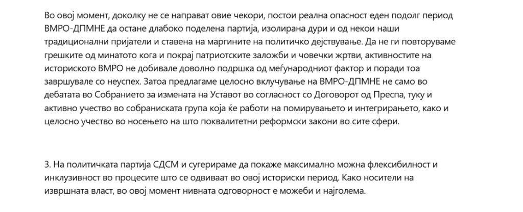 Во овој момент, доколку не се направат овие чекори, постои реална опасност еден подолг период ВМРО-ДПМНЕ да остане длабоко поделена партија, изолирана дури и од некои наши традиционални пријатели и ставена на маргините на политичко дејствување. Да не ги повторуваме грешките од минатото кога и покрај патриотските заложби и човечки жртви, активностите на историското ВМРО не добивале доволно подршка од меѓународниот фактор и поради тоа завршувале со неуспех. Затоа предлагаме целосно вклучување на ВМРО-ДПМНЕ не само во дебатата во Собранието за измената на Уставот во согласност со Договорот од Преспа, туку и активно учество во собраниската група која ќе работи на помирувањето и интегрирањето, како и целосно учество во носењето на што поквалитетни реформски закони во сите сфери.