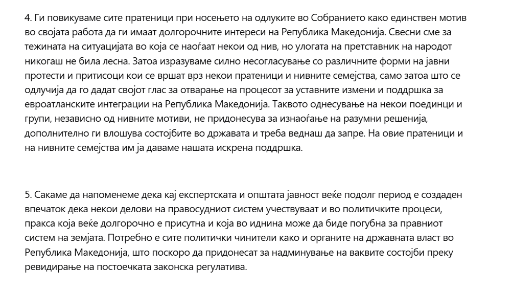 4. Ги повикуваме сите пратеници при носењето на одлуките во Собранието како единствен мотив во својата работа да ги имаат долгорочните интереси на Република Македонија. Свесни сме за тежината на ситуацијата во која се наоѓаат некои од нив, но улогата на претставник на народот никогаш не била лесна. Затоа изразуваме силно несогласување со различните форми на јавни протести и притисоци кои се вршат врз некои пратеници и нивните семејства, само затоа што се одлучија да го дадат својот глас за отварање на процесот за уставните измени и поддршка за евроатланските интеграции на Република Македонија. Таквото однесување на некои поединци и групи, независно од нивните мотиви, не придонесува за изнаоѓање на разумни решенија, дополнително ги влошува состојбите во државата и треба веднаш да запре. На овие пратеници и на нивните семејства им ја даваме нашата искрена поддршка.