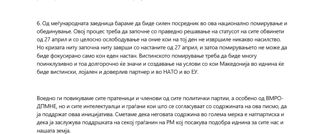 6. Од меѓународната заедница бараме да биде силен посредник во ова национално помирување и обединување. Овој процес треба да започне со праведно решавање на статусот на сите обвинети од 27 април и со целосно ослободување на оние кои на тој ден не извршиле никакво насилство. Но кризата ниту започна ниту заврши со настаните од 27 април, и затоа помирувањето не може да биде фокусирано само кон еден настан. Вистинското помирување треба да биде многу поинклузивно и тоа долгорочно ќе значи и создавање на услови со кои Македонија во иднина ќе биде вистински, лојален и доверлив партнер и во НАТО и во ЕУ.