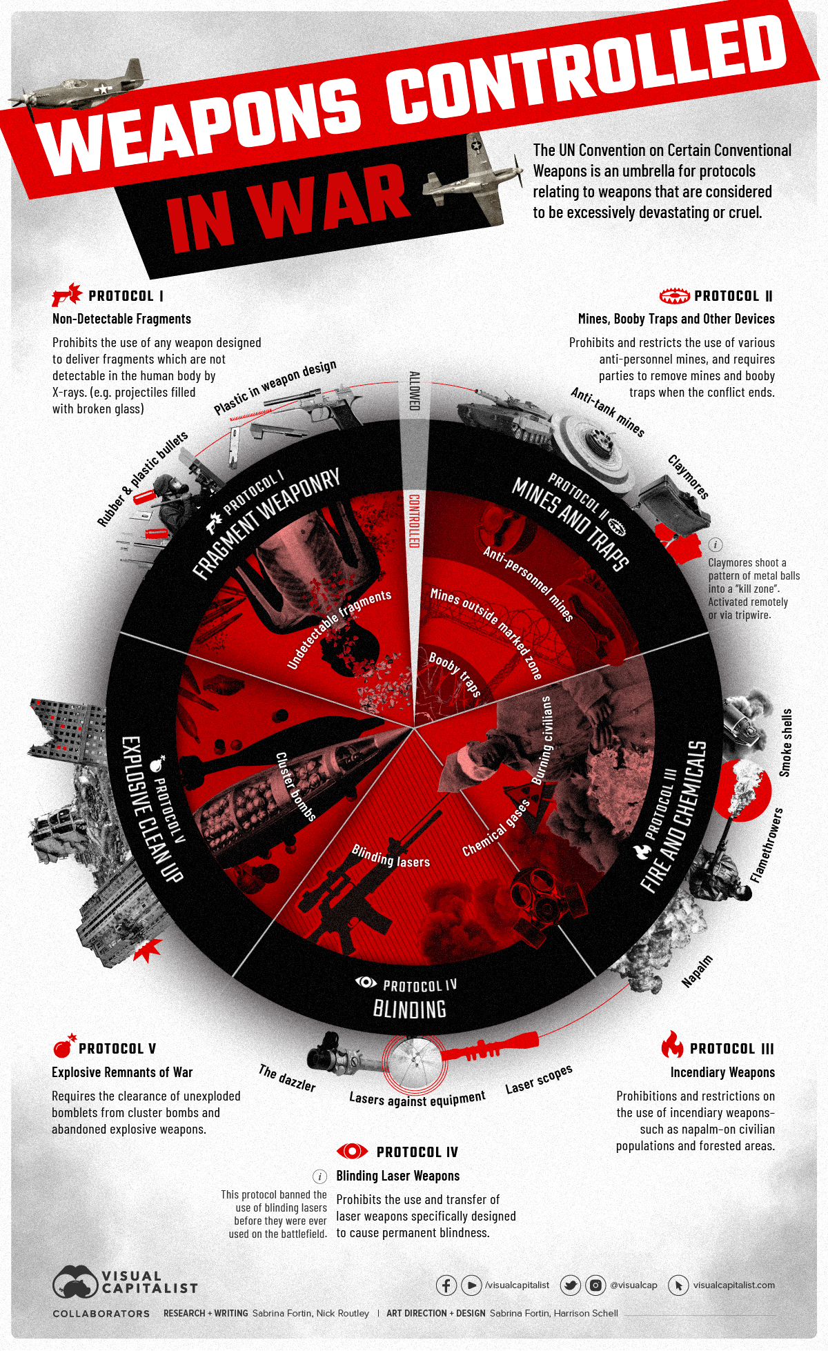 Во инфографикот подолу, Кармен Анг и Сабрина Фортин од Visual Capitalist ги наведува оружјата што се забранети или ограничени во војна, според меѓународните хуманитарни закони што се наведени во Конвенцијата на Обединетите нации за одредени конвенционални оружја (CCW).