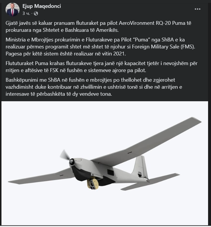 Беспилотни летала „AeroVironment RQ-20 Puma“, купени од САД се испорачани во Косово минатата недела, објави денеска министерот за одбрана на Косово во технички мандат, Ејуп Маќедонци.