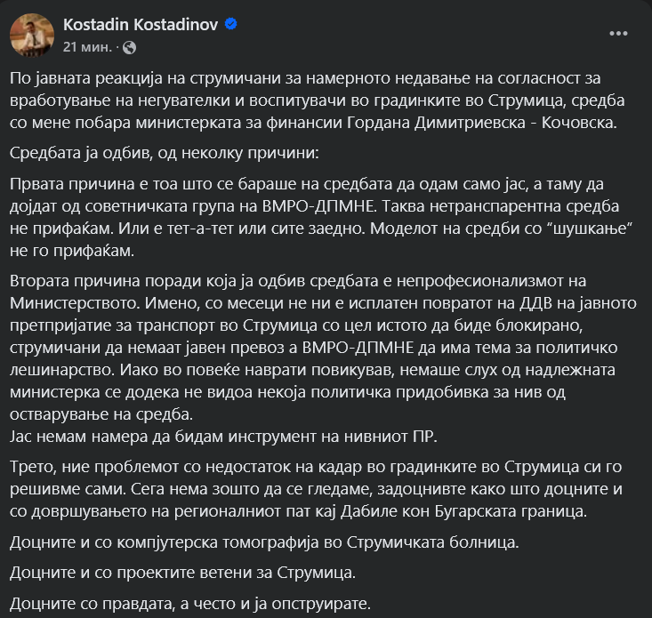 Струмичкиот градоначалник, Костадин Костадинов, одбил средба со министерката за финансии Гордана Димитриевска-Кочоска бидејќи, како што вели, Министерството задоцнило со сите проекти за Струмица.