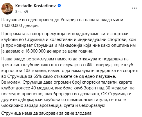 Програмата за спорт преку која ги поддржуваме сите спортски клубови во Струмица и колективни и индивидуални спортови, кои ја промовираат Струмица и Македонија која ние како општина им ја даваме е 16.000.000 денари за цела година, пишува на Фејсбук градоначалникот на Струмица, Костадин Костадинов.